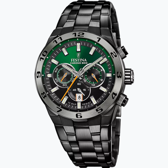 Festina präsentiert die ikonische Chrono Bike Kollektion, die am sehnlichsten erwartete und dank ihrer hochwertigen Materialien, prestigeträchtigen Oberflächen und Verweise auf die Welt des Radsports, von den Fans am meisten geschätzte Kollektion. Sie besticht durch den großen Charakter ihrer Linie: Eine große Auswahl an Zifferblattfarben kombiniert mit matten und glänzenden Details, verpackt in einem sportlichen Look.